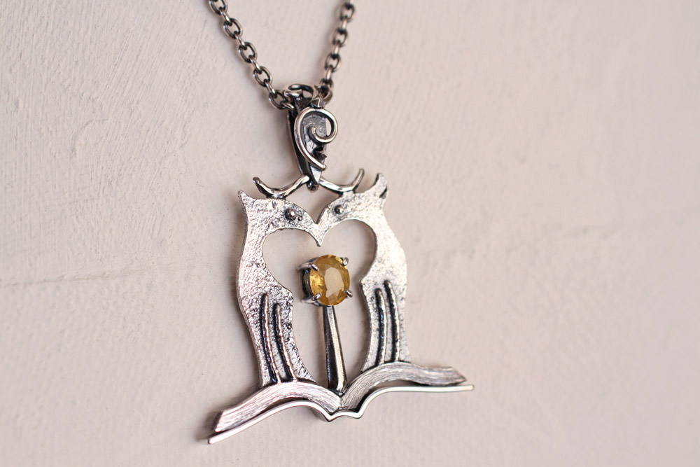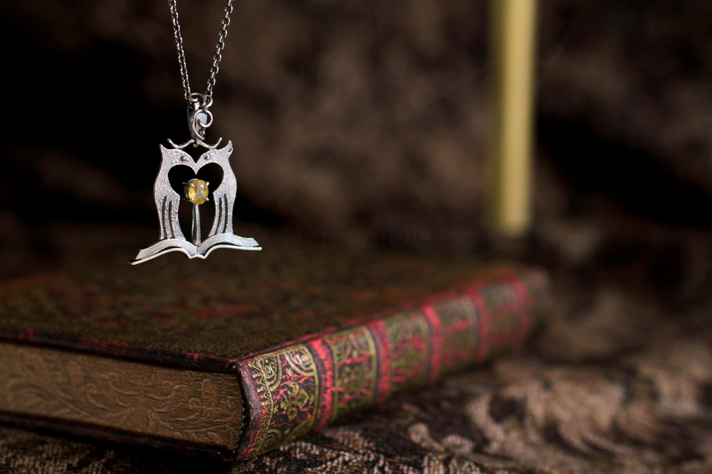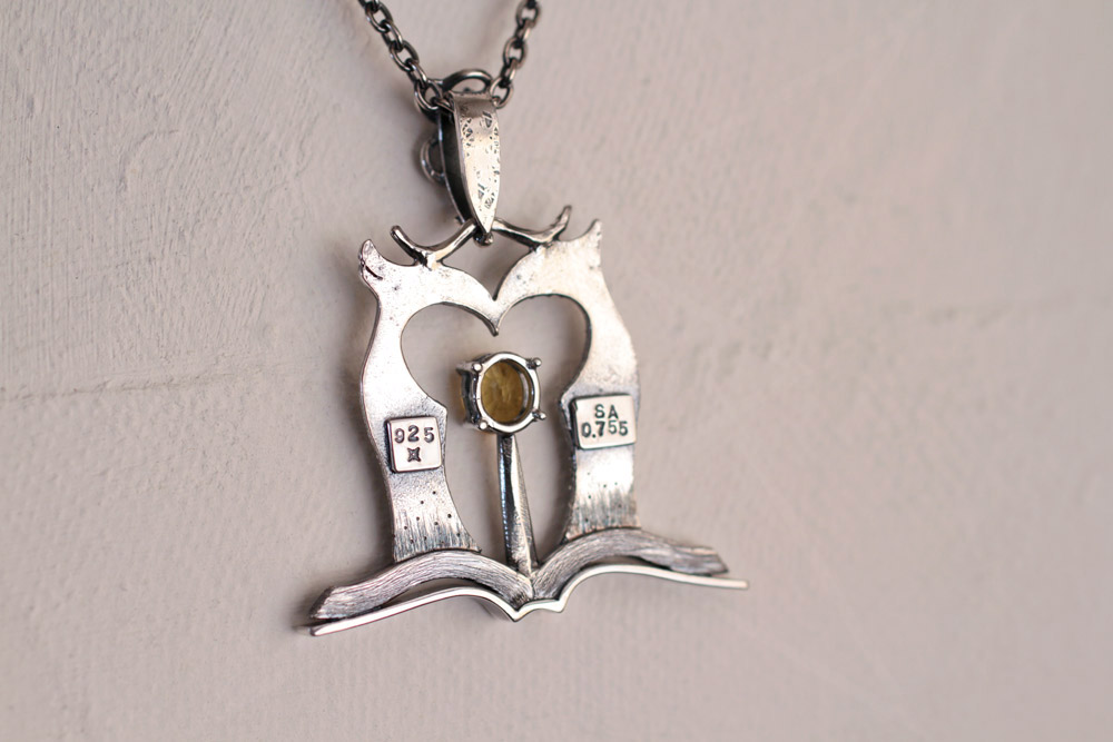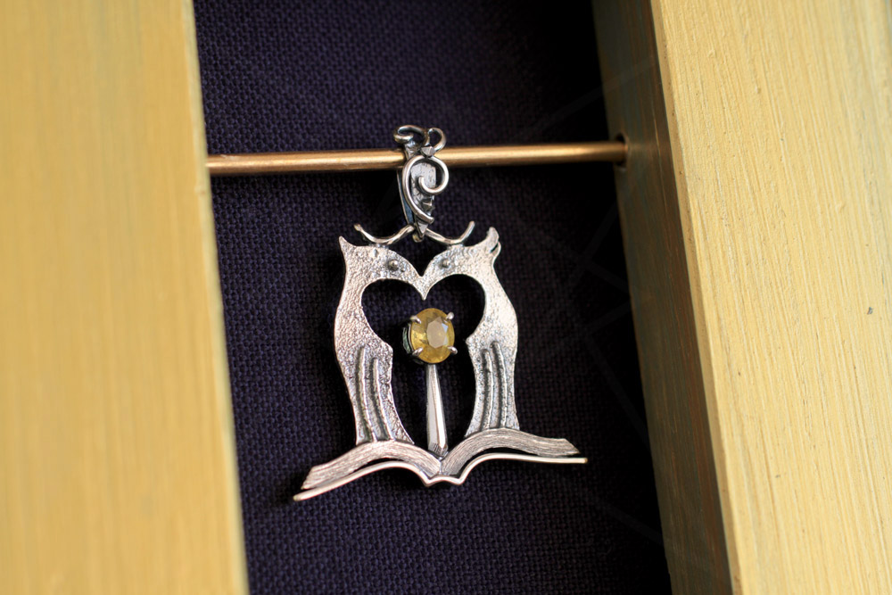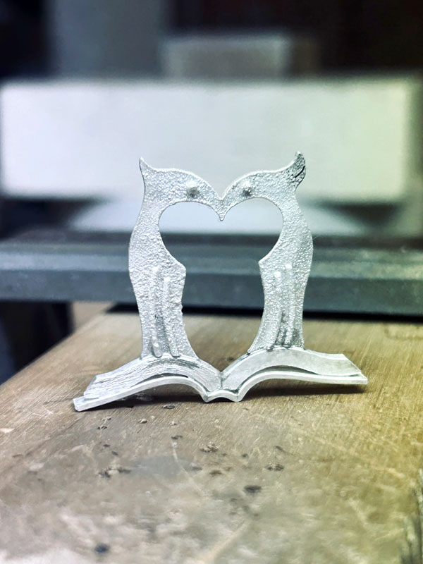 開いた本のパーツは銀材を成形して組み合わせて制作。