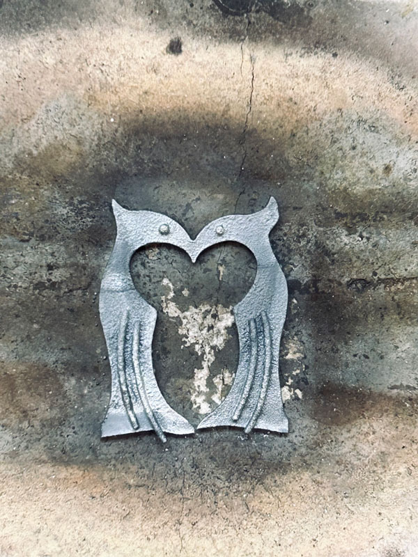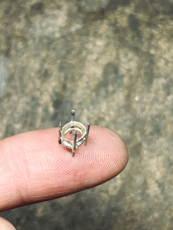 この表面の質感は溶解によるものです。鳥のシルエットを切り抜いた銀板に、目や羽のフォルムのパーツを配置し、溶け崩れない程度に全体を熱して一体にしています。