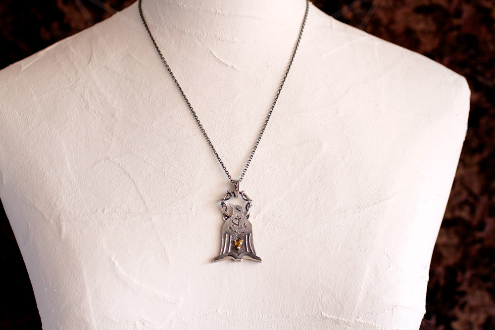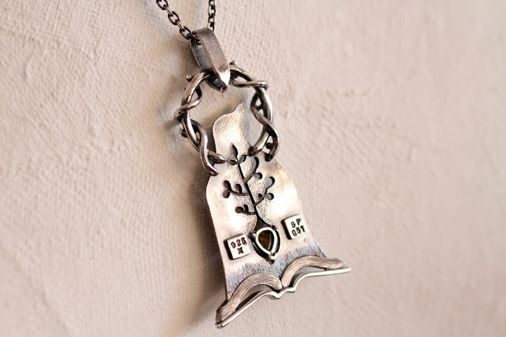 いぶし処理をして一度仕上げの研磨をして石留めをします。ペアシェイプの尖った部分は、袋爪にしてとんがりを包みこむようにしています。