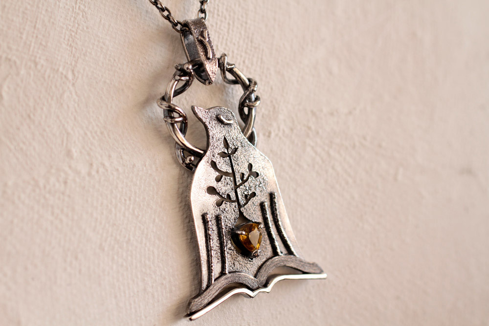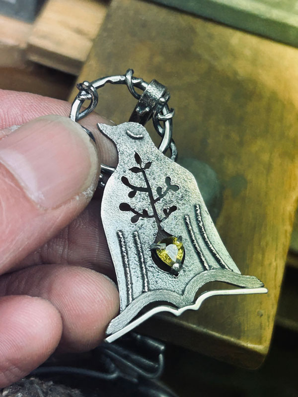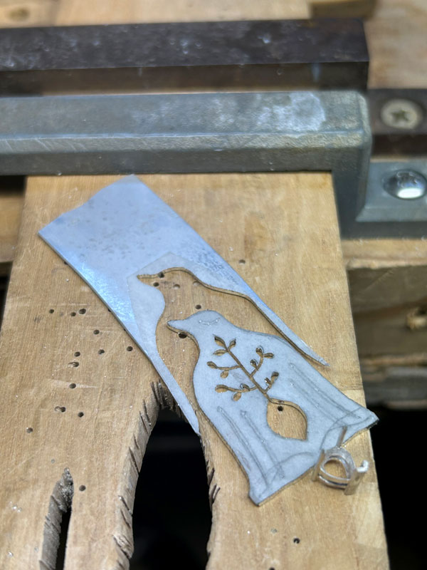 銀板から制作する鳥のシルエットを切り出し。下絵を描いたトレーシングペーパーを銀板に両面テープで貼り付けてから糸鋸3/0を使用して切り出しています。