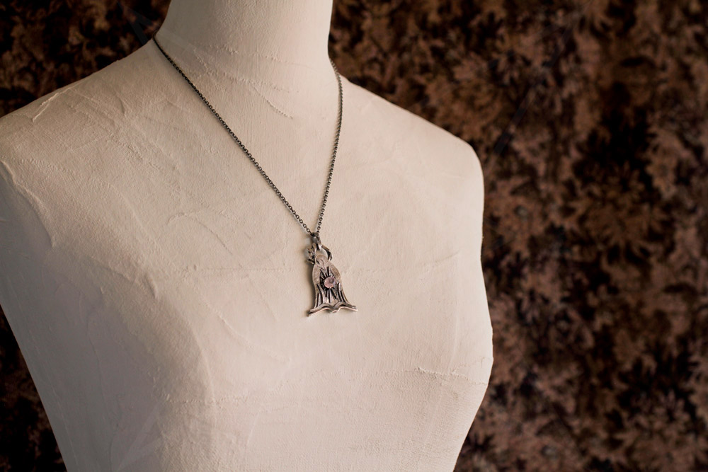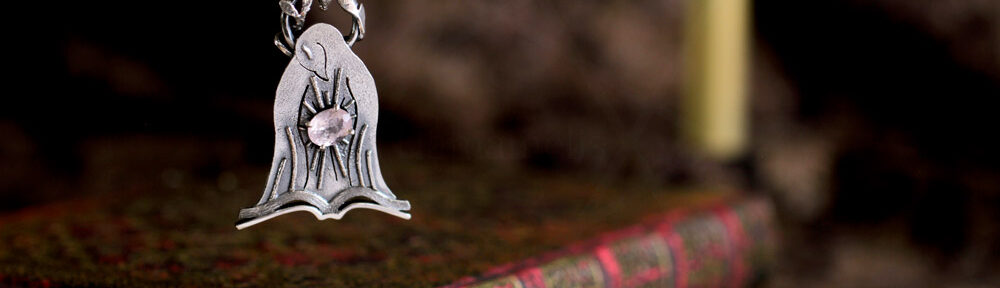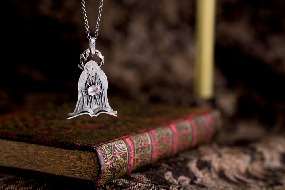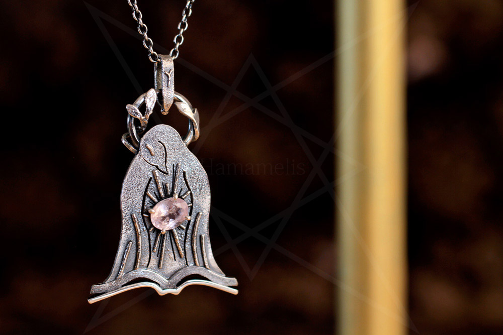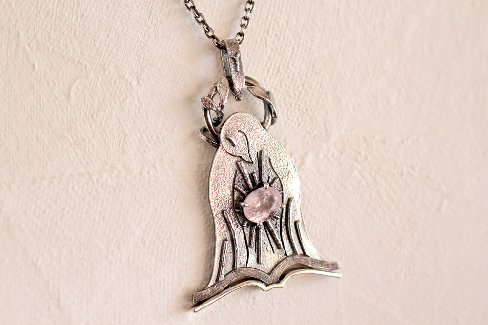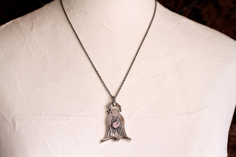 鳥の胸元でモルガナイトが輝いている様子を「ニンバス(後光)」のデザインを丸線を組み合わせて構成しています。