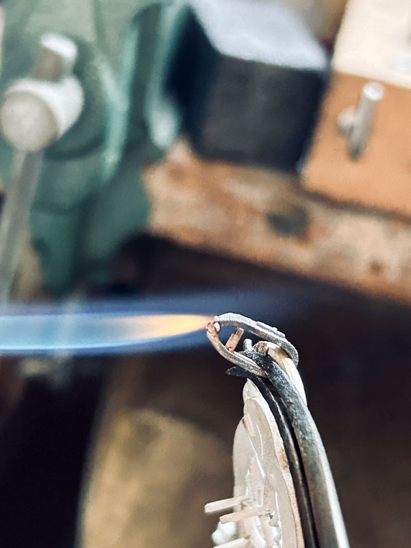 バチカン部分の溶接の様子。バチカンはチェーンの通るパーツのことで、もともとは三味線や枇杷の演奏で使うバチの形に似ているところからそう呼ばれているそうです。