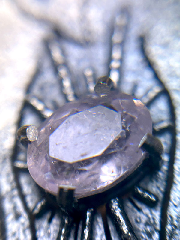 石留め直後に不要な爪をカットした状態。最近ファセットカットの爪留めの場合は爪に糸鋸0/6でわずかに切り込みを入れてから少し倒し込み、せばまった切り込みに再度わずかに切り込みを入れたのち、爪を完全に倒し込んでいます。
